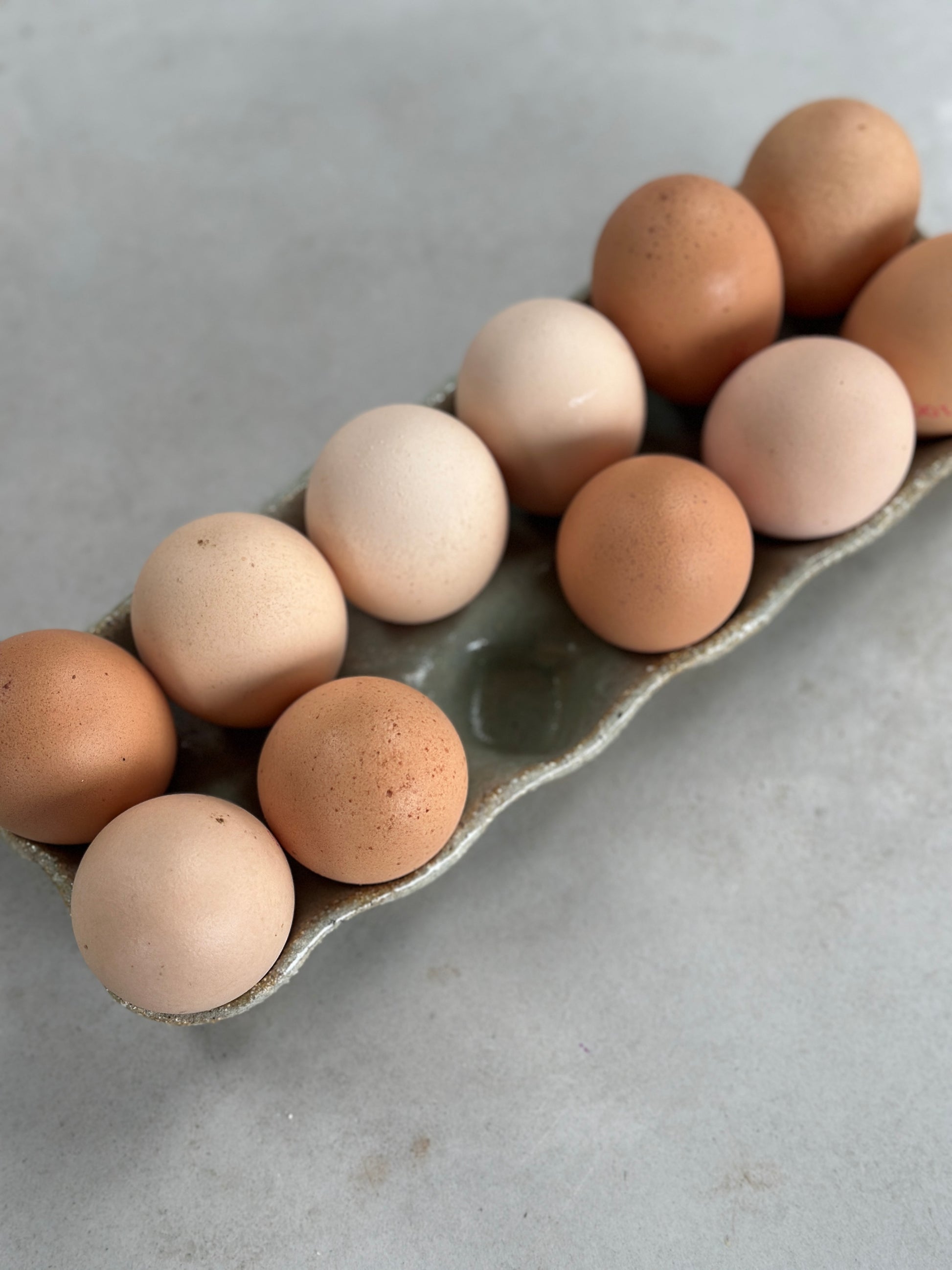Ceramic handcrafted egg carton. Fits 12 eggies (but I only had 11 available...toddler mum life).